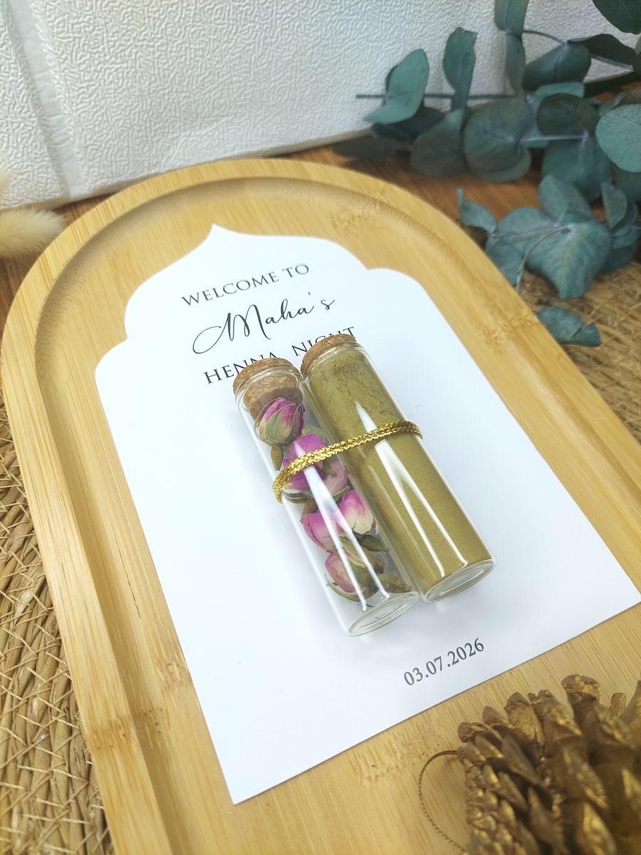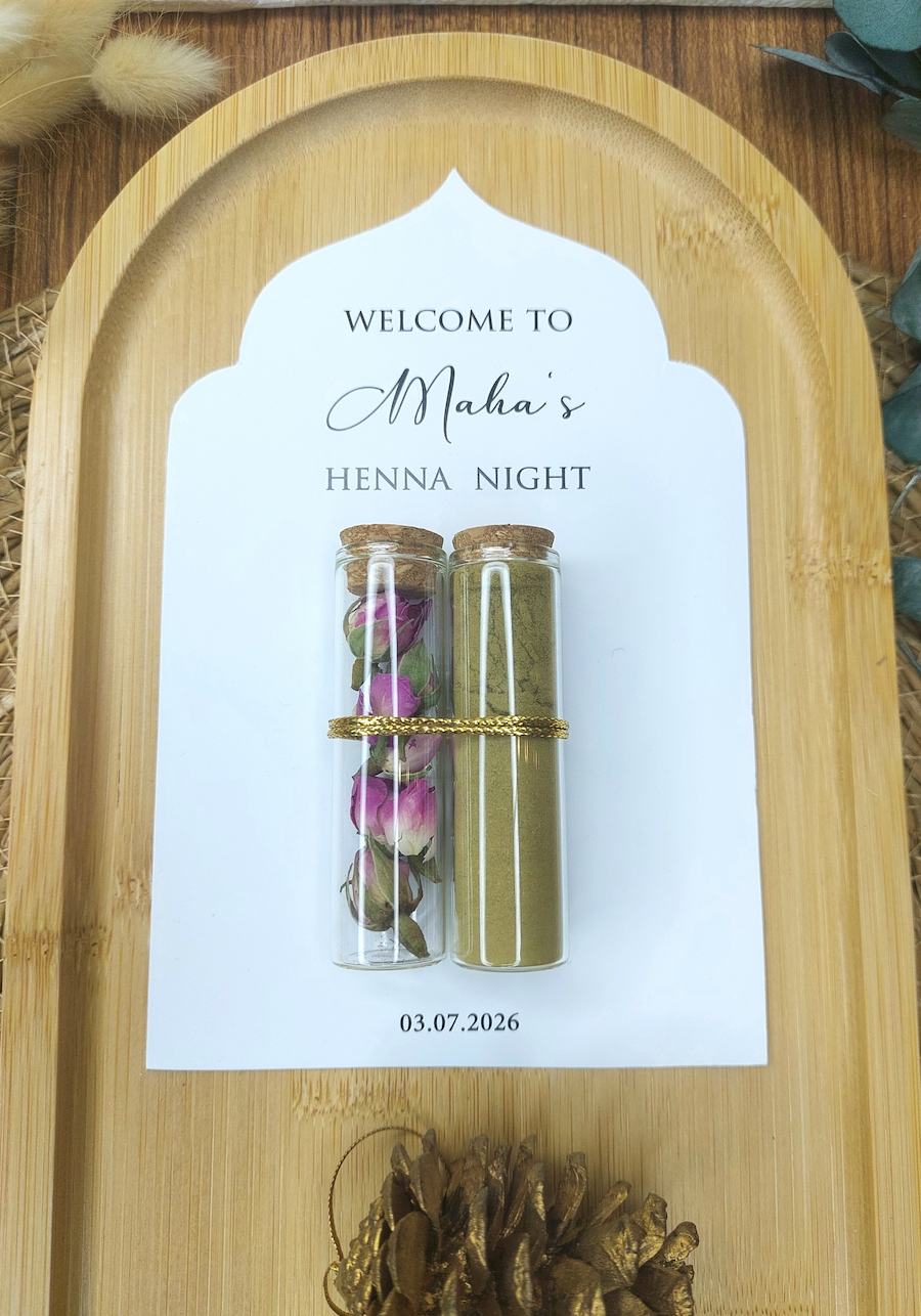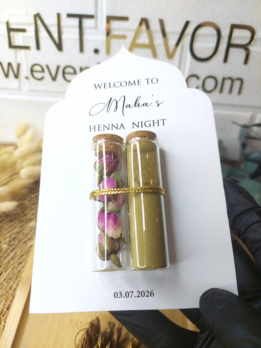 Bouteille De Henné Rose Avec Carte est un souvenir raffiné idéal pour une soirée henné pleine d’émotion et de tradition. Cette jolie fiole décorative, accompagnée de sa carte élégante, contient du henné vert en poudre ainsi que des pétales de rose séchés de couleur rose, symbolisant la beauté et la prospérité. Parfaite pour représenter le henné mariée marocaine avec douceur et authenticité, elle est présentée comme un coffret henné mariage délicat. Ce cadeau élégant apporte une touche romantique et laisse un souvenir précieux et durable aux invitées.